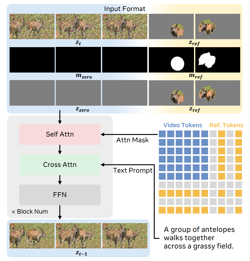 在自注意力中, z in z_{\text{in}} zin 的视频部分和参考部分彼此交互。为避免关注到非参考区域,我们将每个 M k M_k Mk 调整大小以匹配展平后的潜变量形状,从而形成注意力掩码;在该掩码下,视频 token 之间可以双向注意,而在参考部分中,只对有效的参考区域进行注意。