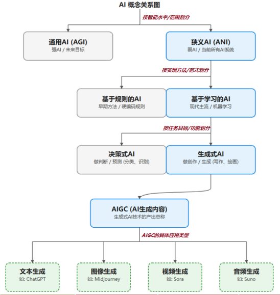 要理解AI视频,首先需梳理AI领域的关键概念,明确其技术定位: