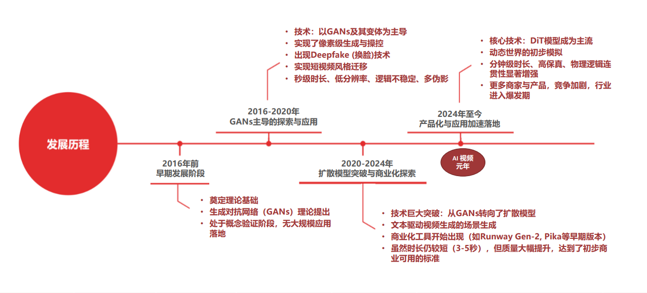 - 2016-2020年:GANs主导的探索期,实现像素级生成与操控,出现Deepfake技术,可完成短视频风格迁移,但存在时长短、分辨率低、逻辑不稳定等问题;