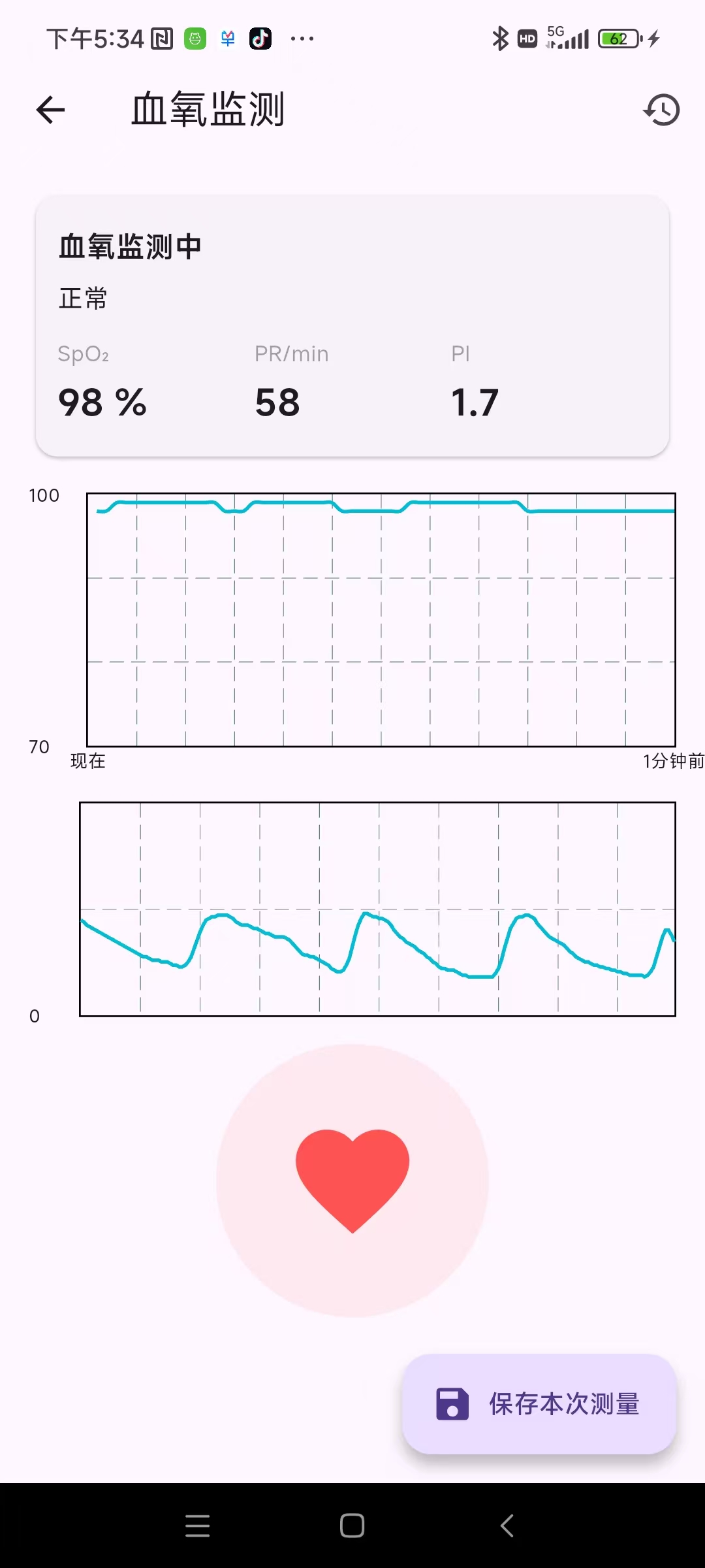 血氧首页:实时数据、折线趋势图、波形图、心率心形动画、保存按钮oximeter_connect_page.dart