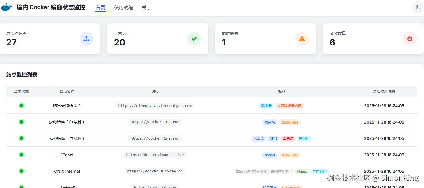 现在有一款在线监控境内Docker镜像状态的网站来了,可以直观的看到哪一个镜像源可用,哪一个慢,哪一个离线了。非常方便,亲测可用。