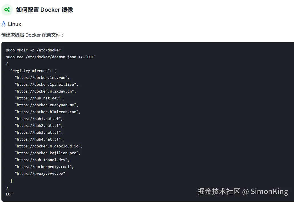 配置容器的镜像源更是提供了傻瓜式命令,复制黏贴即可。