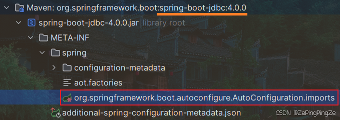 DataSourceTransactionManagerAutoConfiguration 这个自动配置类在 【spring-boot-jdbc-4.0.0.jar 中的 META-INF\spring\org.springframework.boot.autoconfigure.AutoConfiguration.imports】 中进行自动配置。