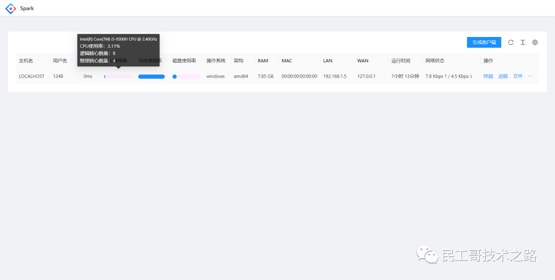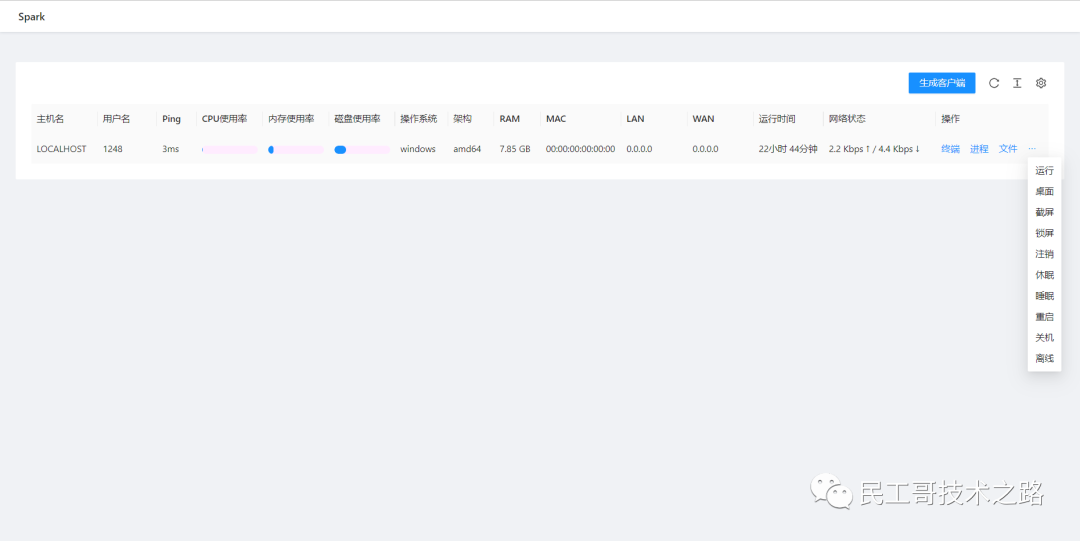 用一句话介绍该项目就是:Spark是一个 Go 编写的,网页UI、跨平台以及多功能的远程控制和监控工具,你可以随时随地监控和控制所有设备。