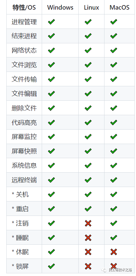 目前 Spark 支持主流的三个系统 Windows、Linux、MacOS,功能基本在三个系统上都支持,有部分差异。功能列表如下图: