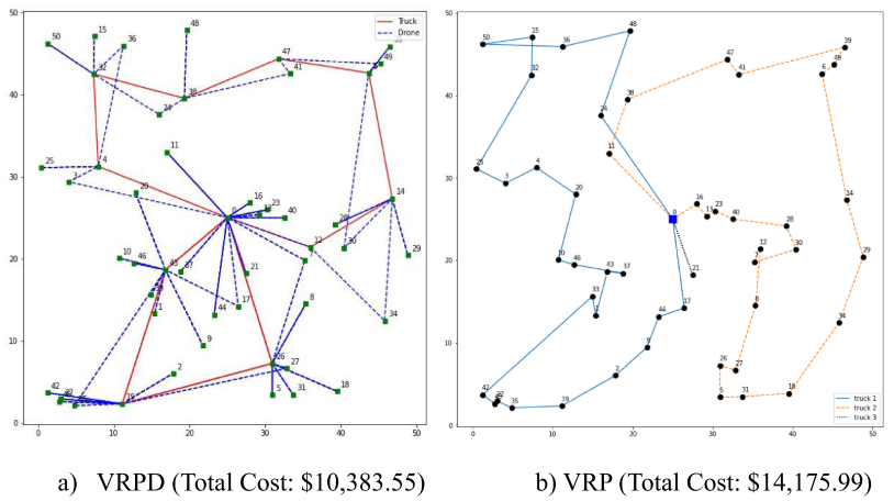 随着电商与物流行业对快速、高效配送的需求不断攀升,无人机成为提升配送速度与灵活性的关键技术。研究表明,无人机与卡车协同执行包裹投递,不仅能显著降低运营成本和碳排放,还可缩短整体配送时间。本文构建了一个混合整数规划模型,用于解决无人机车辆路径问题(VRPD)。模型内容包括:为客户分配无人机-卡车组合、确定所需的派遣单元数量,并在最小化两类车辆固定与行驶成本的前提下规划最优配送路径。由于 VRPD 属于 NP-hard 问题,研究进一步设计了蚁群算法(ACO)进行求解。为提升协同配送效率,研究提出两种创新策略:在卡车停靠期间,允许无人机对单个或多个可行客户执行额外的配送任务,从而提高整体服务能力。