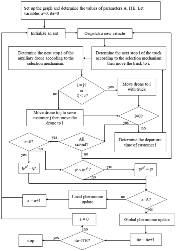 基于蚁群系统求解 VRPD,每只蚂蚁构造一条卡车-无人机配送路线。算法通过路径选择:依据信息素与可见度决定下一客户节点,在探索与利用之间平衡。局部更新:蚂蚁访问后即时蒸发并补充信息素,避免过早收敛。全局更新:所有蚂蚁完成后,对当前最优路径强化信息素,引导搜索趋向优质解。