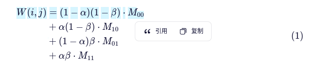 则双线性插值结果为: [ \begin{aligned} W(i,j) &= (1-\alpha)(1-\beta) \cdot M(x_0, y_0) \ &+ \alpha(1-\beta) \cdot M(x_1, y_0) \ &+ (1-\alpha)\beta \cdot M(x_0, y_1) \ &+ \alpha\beta \cdot M(x_1, y_1) \end{aligned} ]