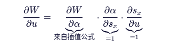 权重 ( (1-\alpha)(1-\beta) ) 等是 ( \alpha, \beta ) 的多项式函数 → 光滑可导: [ \frac{\partial W}{\partial \alpha} = -(1-\beta)M(x_0,y_0) + (1-\beta)M(x_1,y_0) - \beta M(x_0,y_1) + \beta M(x_1,y_1) ] 而 ( \alpha = x - \lfloor x \rfloor = (i + u_x) - \lfloor i + u_x \rfloor ),在非整数点处 ( \frac{\partial \alpha}{\partial u_x} = 1 )(几乎处处成立)。
