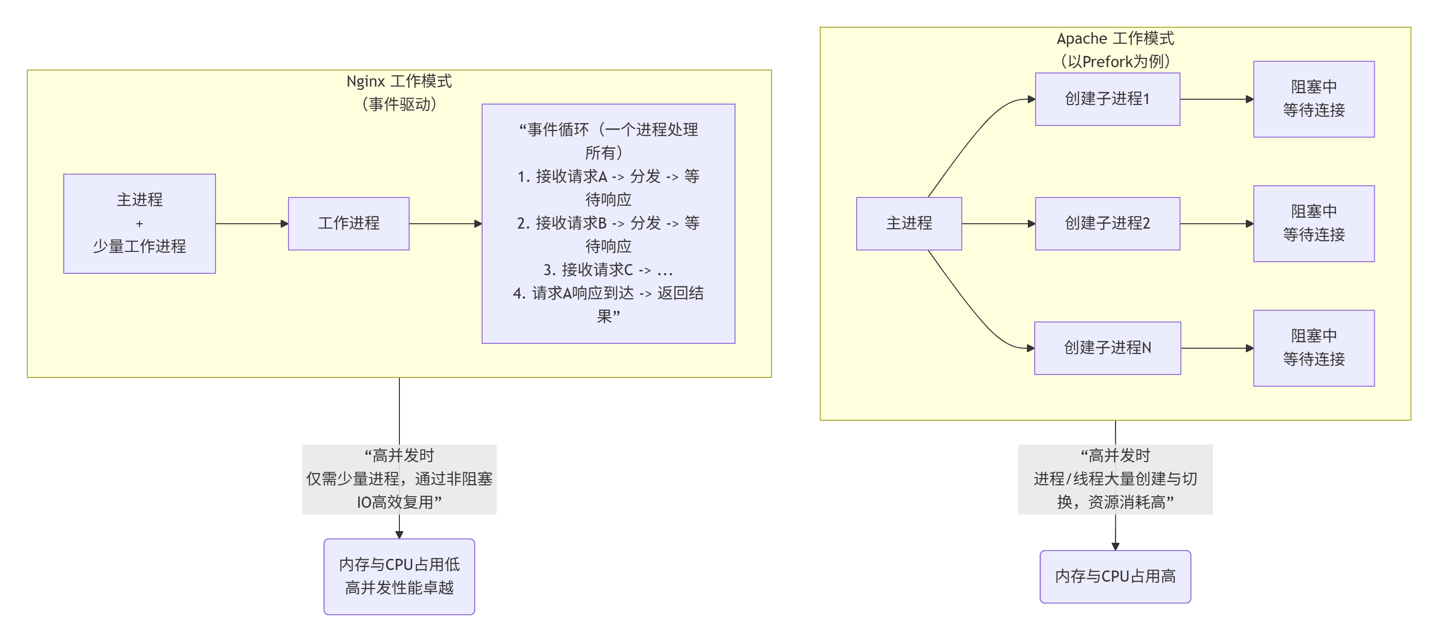 | 架构模型 | 多进程/多线程,同步阻塞I/O | 事件驱动,异步非阻塞I/O |