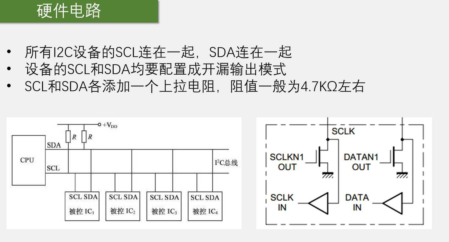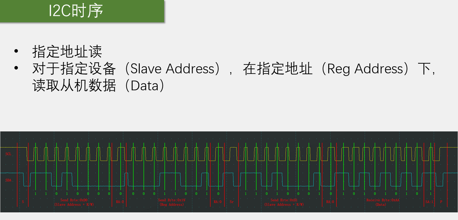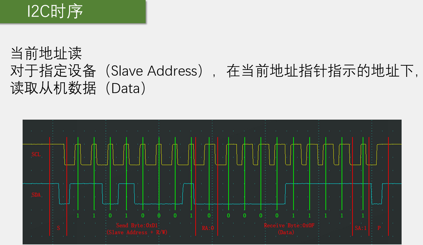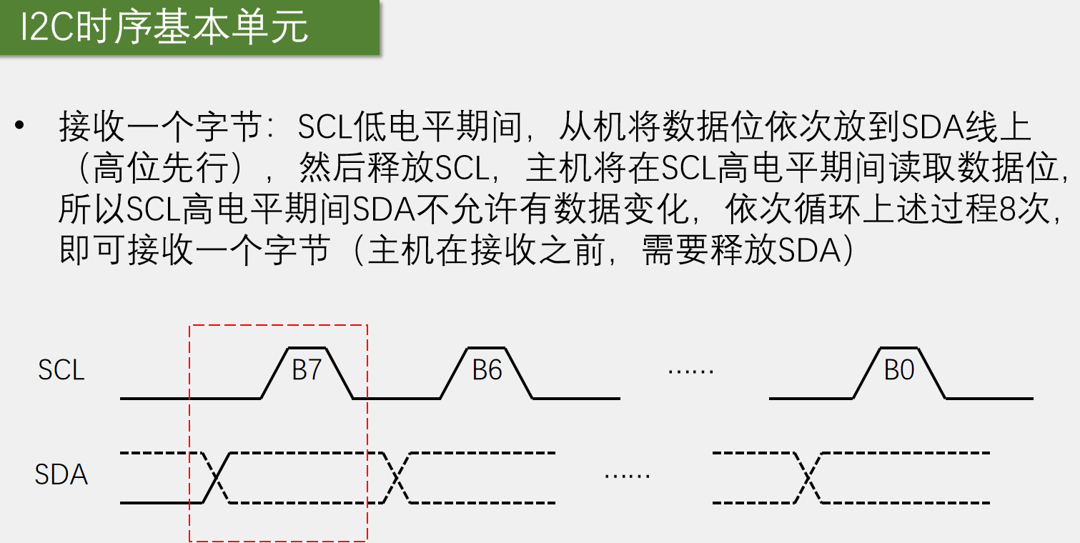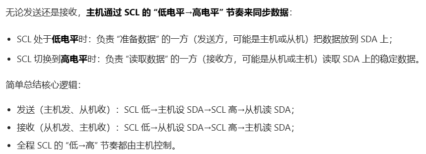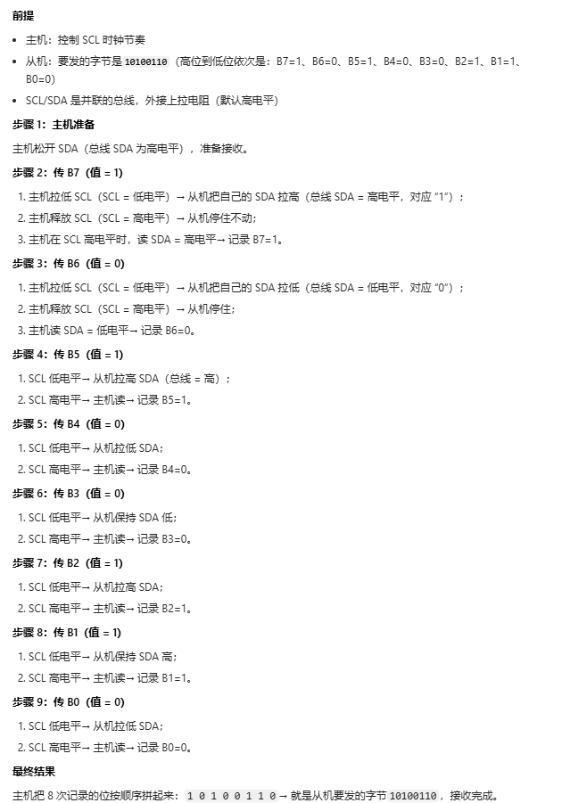 从机发送数据给主机,主机SCL低电平,从机控制SDA发送数据,然后主机SCL高电平,完成接收,以此类推