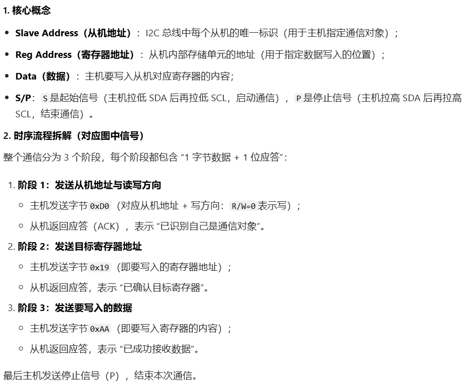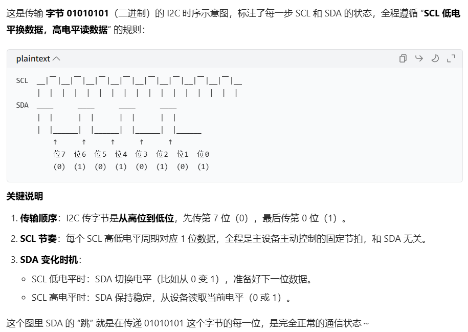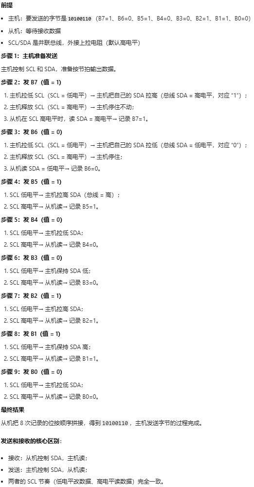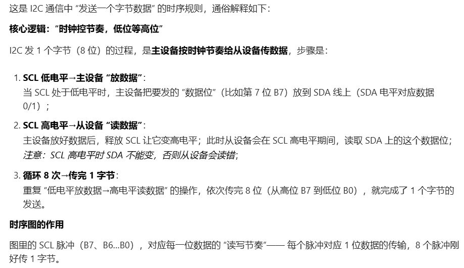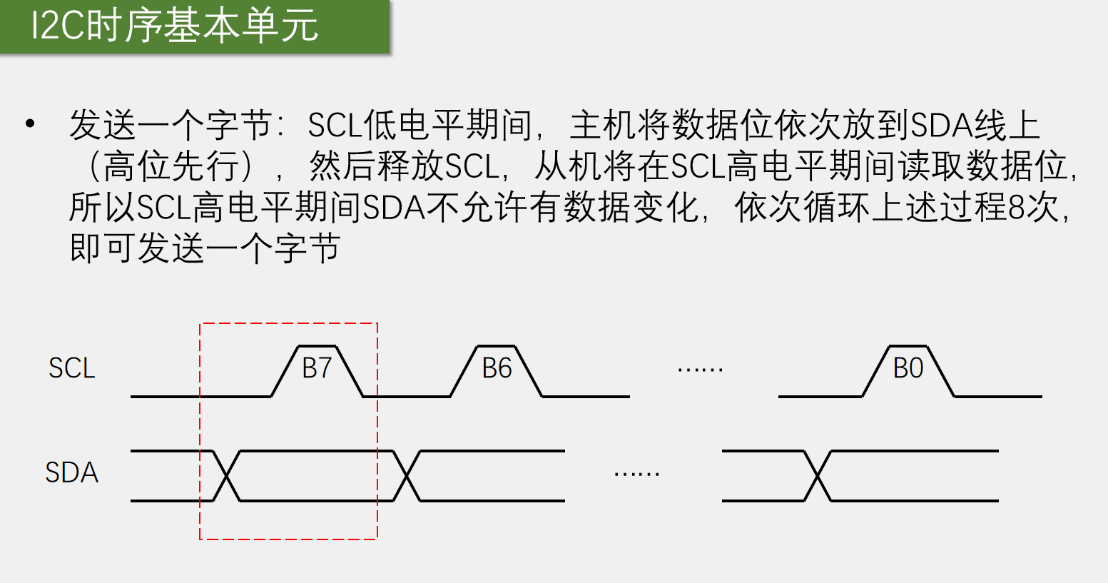 这个主机发送数据到从机,主机控制着SCL和SDA两条线,当SCL低电平的时候,准备发送数据,然后SDA线此时发送根据时序对应的数据,比如说是0还是1(高电平),然后SCL变高电平,完成发送,从机在主机SCL高电平的时候,完成接收,然后主机scl低电平准备发送另外一个数据,以此类推