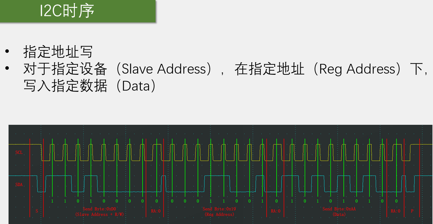 这是一个主机向从机发送数据的一个示波器过程图,首先就是主机向从机发送一个从机的地址位,以及R/W,即是写还是读的意思,然后若从机此时给一个低电平则说明应答,反之就是不应答,然后主机指定从机内部的寄存器地址位置,然后第三步才是发送数据