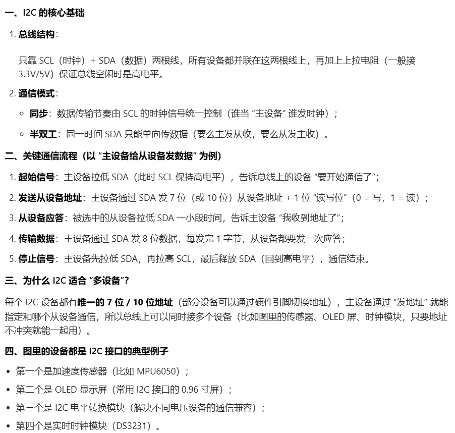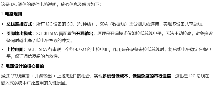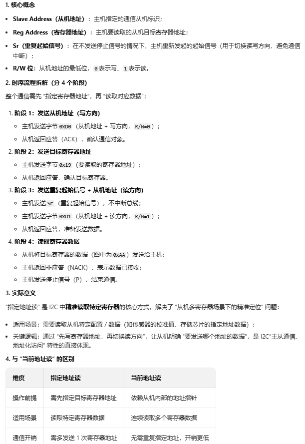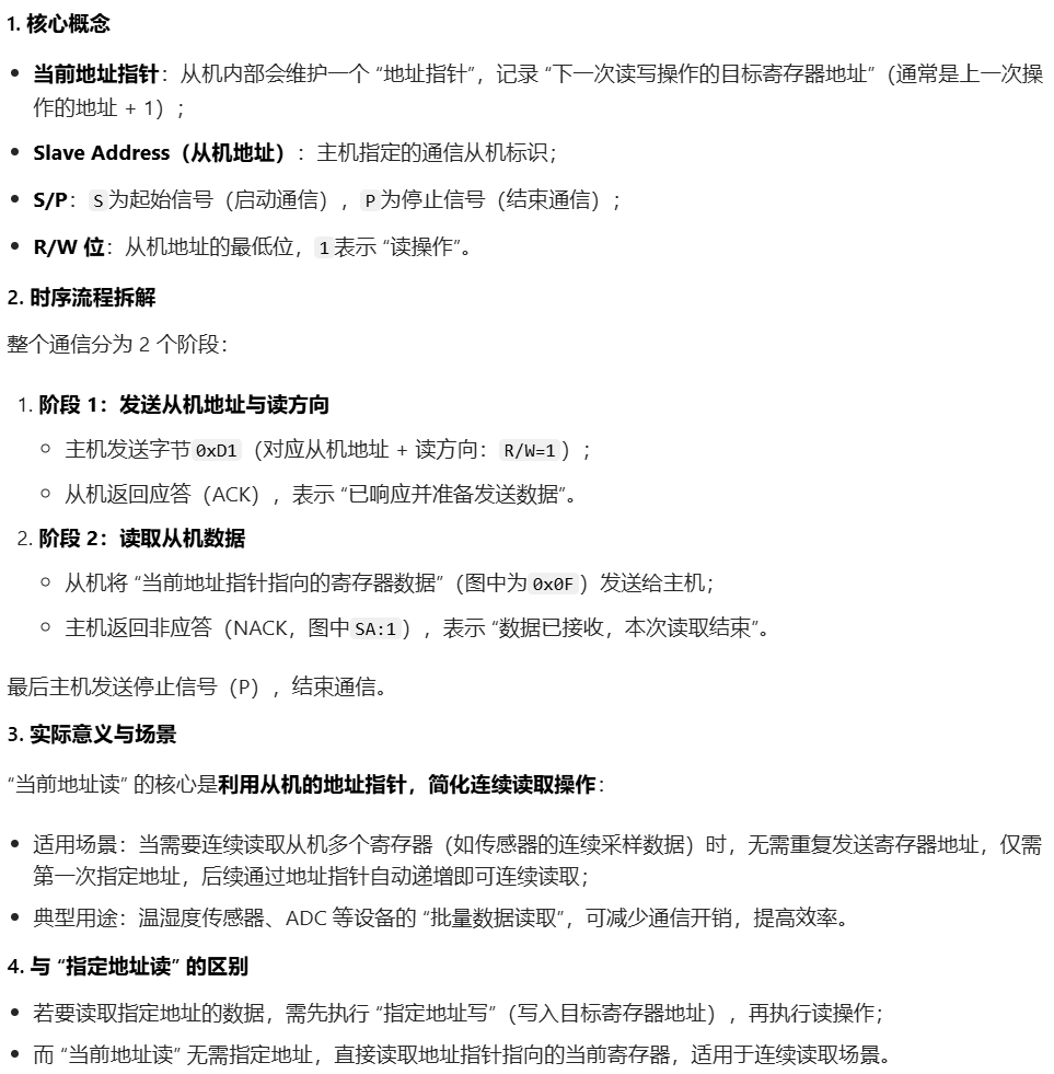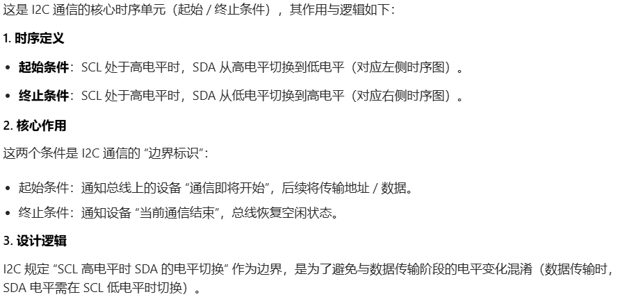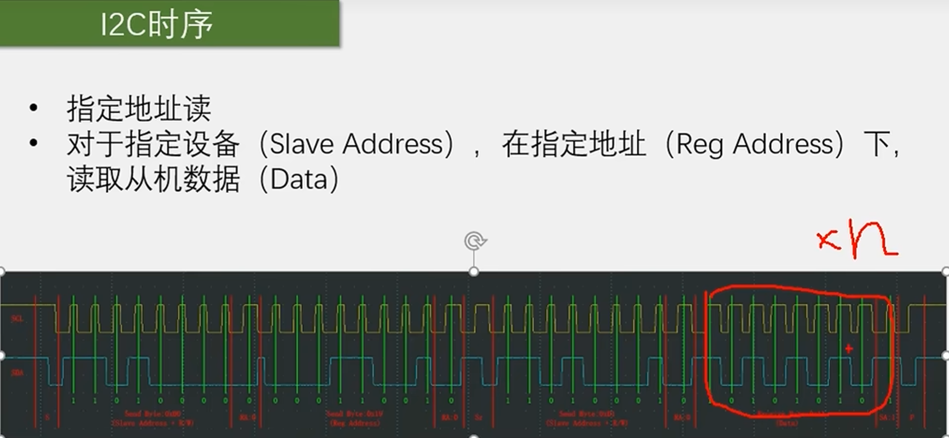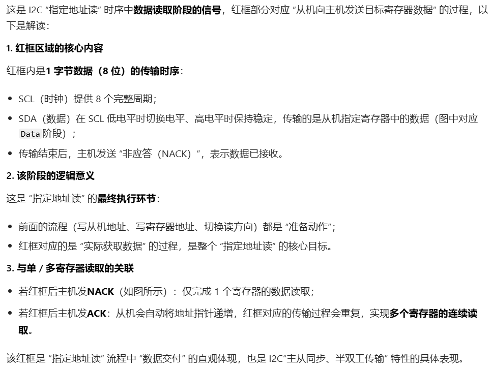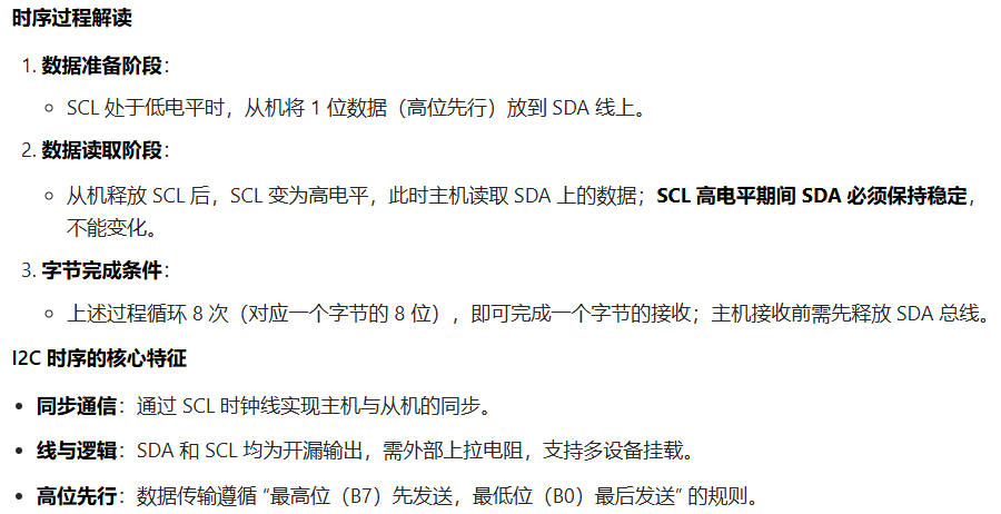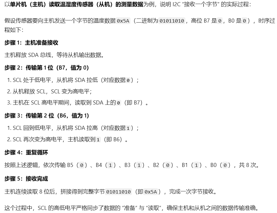 总结一下,主机接收从机数据是怎么进行操作的呢,通过SCL来进行控制,比如说当SCL为低电平的时候,从机根据数据的高低电平,将数据放到SDA上,然后SCL变成高电平,完成接收,第二个数据也是同理,就是主机将SCL低电平,准备接收,此时从机可以控制SDA传输数据位是高是低,然后SCL变为高电平,成功接受