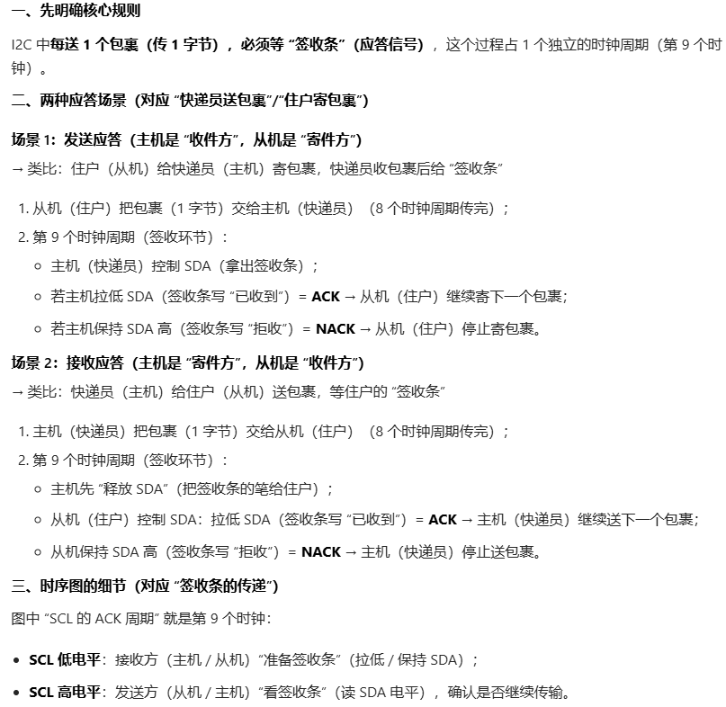 当从机发送数据给主机的时候,发送完一个字节后,然后通过SDA发送一个数据,主机控制SCL,为高电平或者低电平,确认要不要接收数据