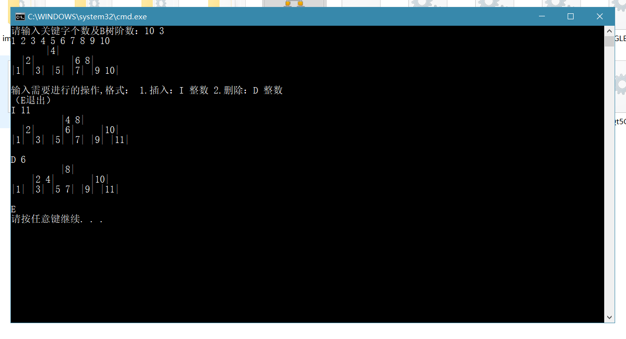 - "/src/BTree"文件中的是原始代码,可以通过控制台对B树操作,并在控制台中可视化;
