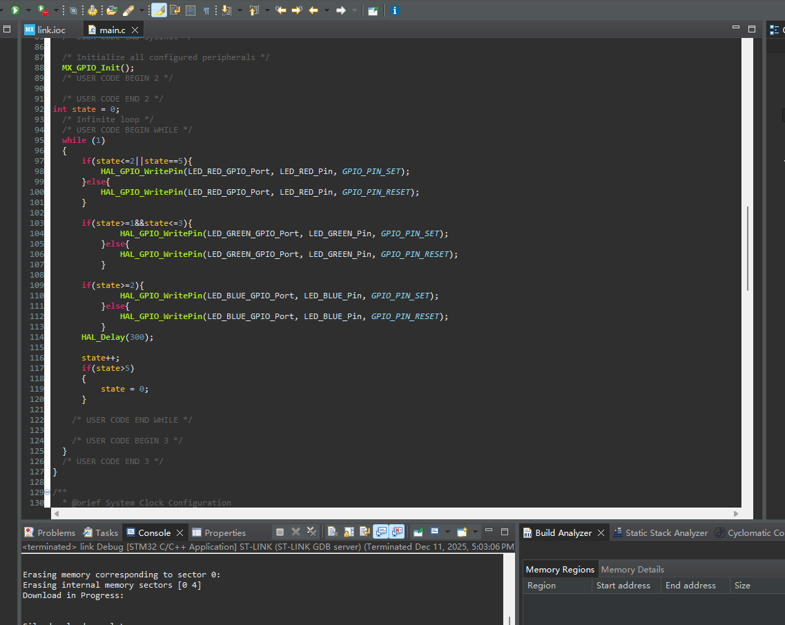 最后点击工具栏的"Build"图标(锤子形状)编译项目。连接开发板到PC。点击"Run"图标(绿色三角形)下载程序到开发板。
