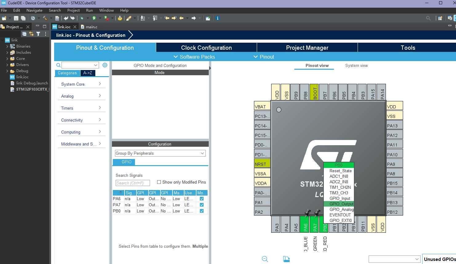 在Pinout & Configuration标签页:点击对应引脚(A6,A7,B0),设置为"GPIO_Output"。