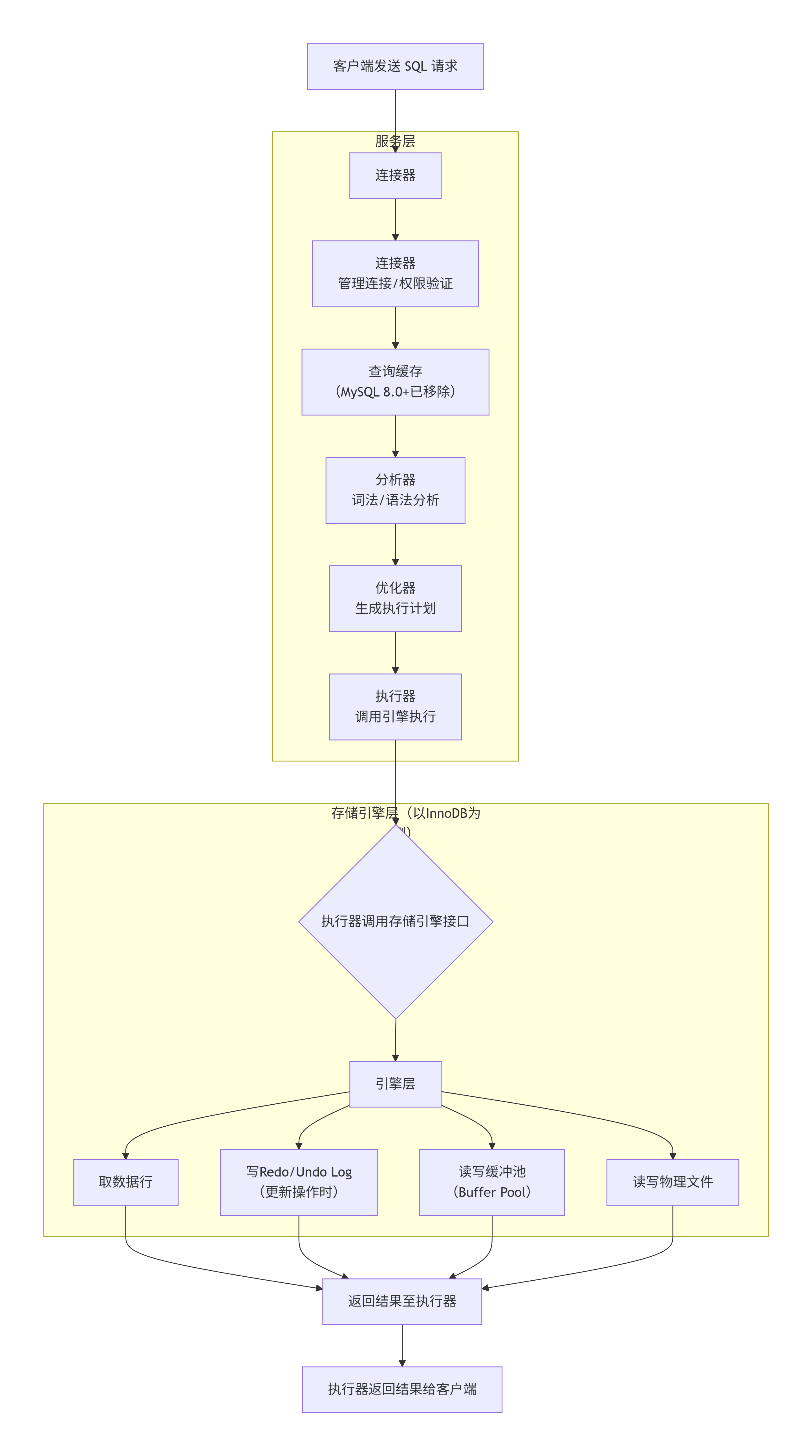 一条 SQL 在 MySQL 中的执行,是一个贯穿服务层 与存储引擎层 的精密过程。