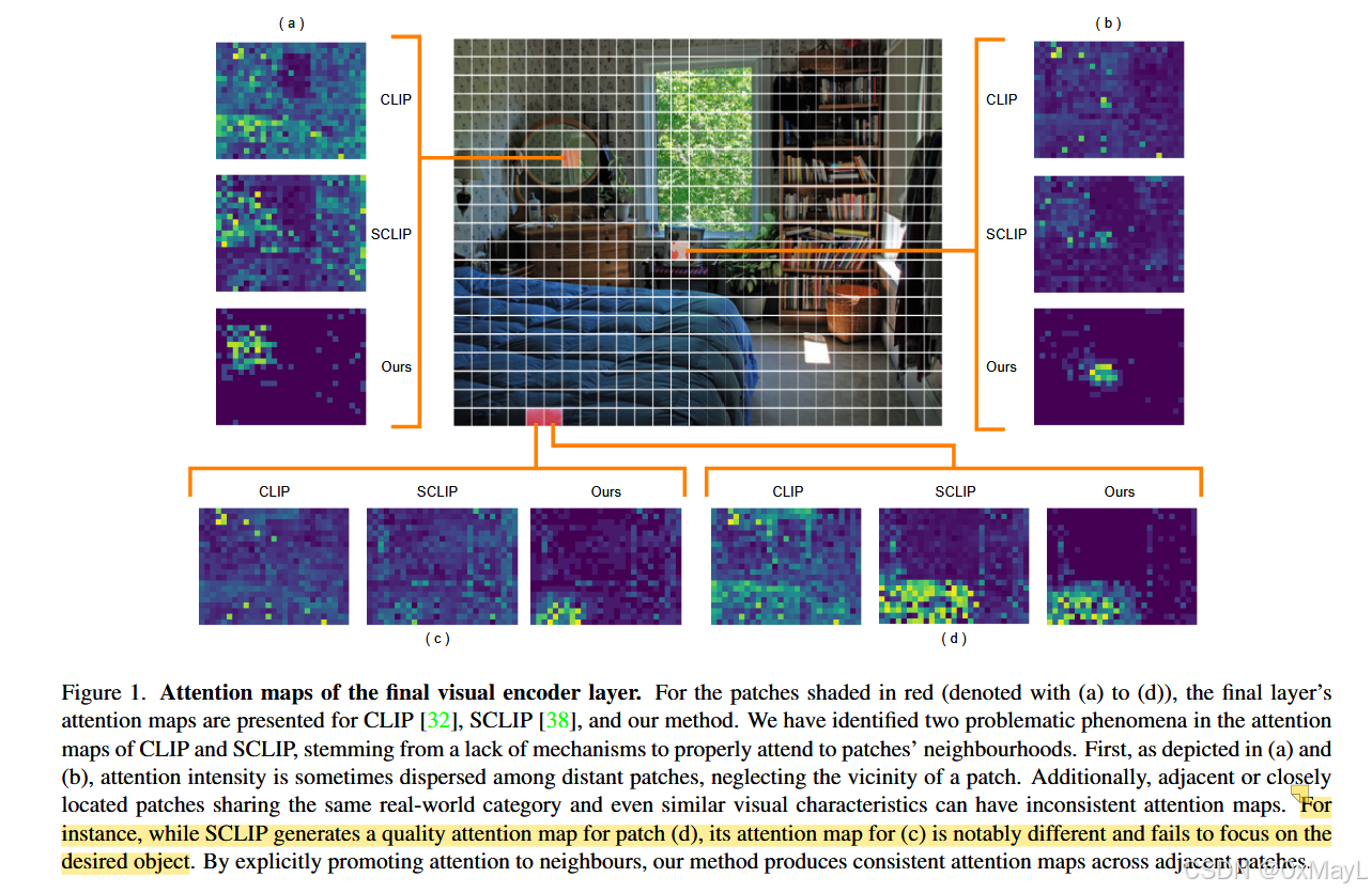 SCLIP 只强调"每个 patch 关注自身",没显式鼓励"关注邻居",导致邻近 patch 的注意力仍可能不一致(Fig.1)。