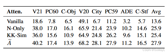 - NACLIP 在 Cityscapes 上比 SCLIP 高了 ~4.2 mIoU。