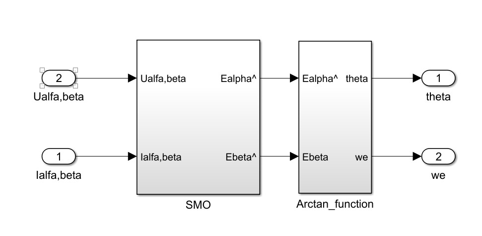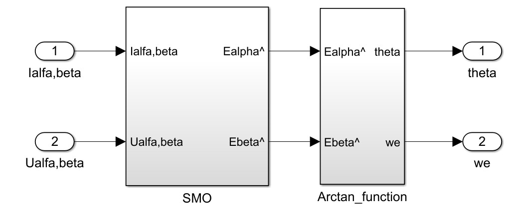 使用一个电流传感器模块获取电机的实际电流 \(i*{\alpha}\) 和 \(i*{\beta}\)。在滑模观测器模块中,我们通过以下离散化的方程来估计电流: