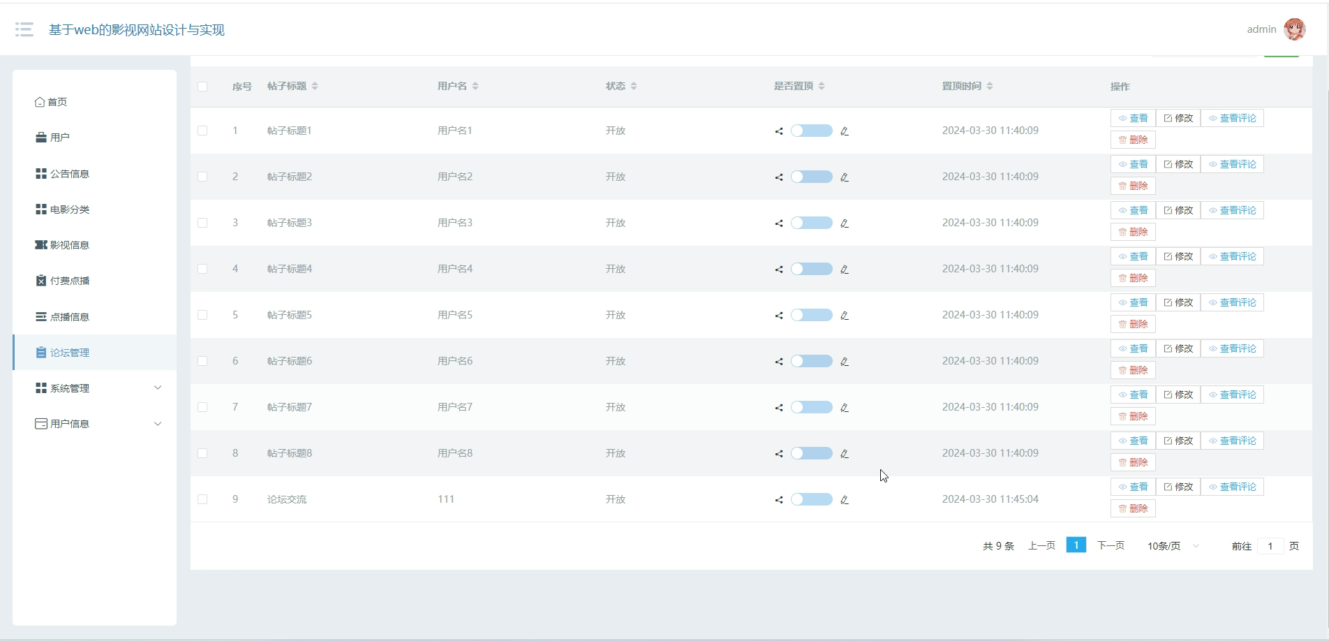 - 后台管理模块:实现影视资源的上传、审核、发布、删除等管理功能,以及用户行为数据的监控和分析功能。管理员可以通过该模块对影视资源进行批量上传和审核,确保资源合法性和质量。同时,通过监控用户行为数据,了解用户需求和观看习惯,为网站运营和优化提供数据支持。