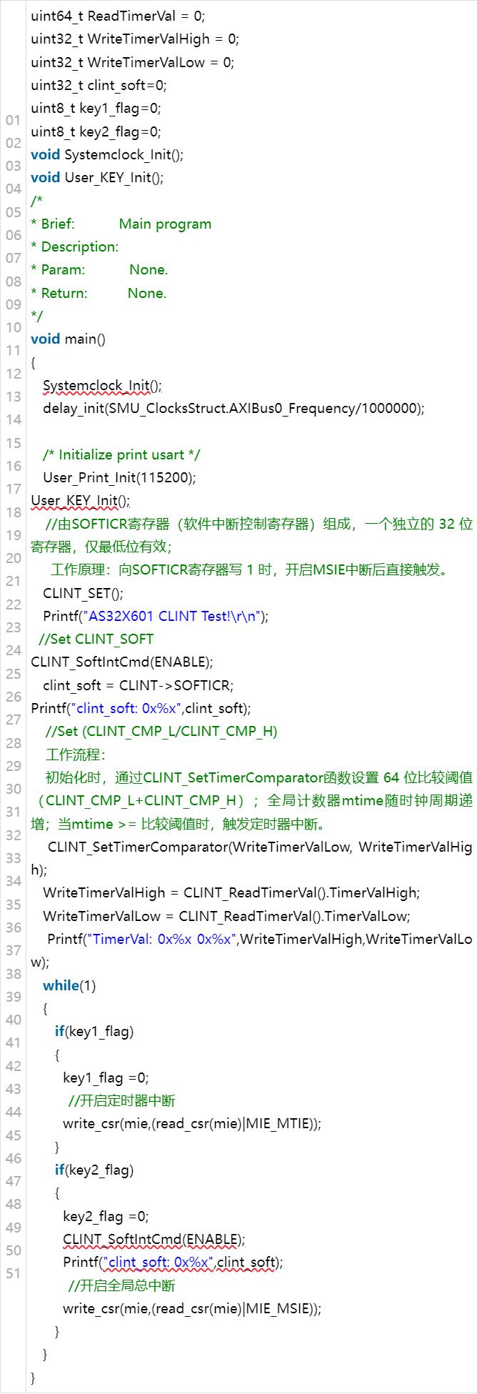 CLINT 的 64 位全局计数器time/timeh提供了高精度的时间基准,可直接用于实现微秒级 / 毫秒级精准延时,无需依赖外部定时器。