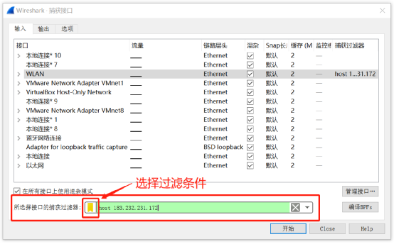 2、选择菜单栏上 捕获 -> 选项,勾选WLAN网卡。这里需要根据各自电脑网卡使用情况选择,简单的办法可以看使用的IP对应的网卡。点击Start,启动抓包。