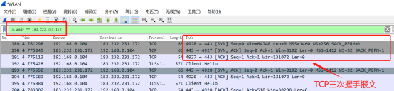 Step3:输入过滤条件获取待分析数据包列表 ip.addr == 183.232.231.172
