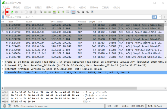 5、操作完成后相关数据包就抓取到了,可以点击 停止捕获分组 按钮。