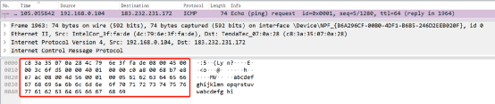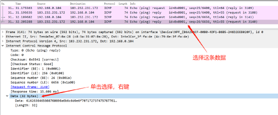 假设我要以ICMP层中的内容进行过滤,可以单击选中界面中的码流,在下方进行选中数据。