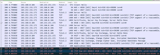 图中可以看到wireshark截获到了三次握手的三个数据包。第四个包才是HTTPS的, 这说明HTTPS的确是使用TCP建立连接的。