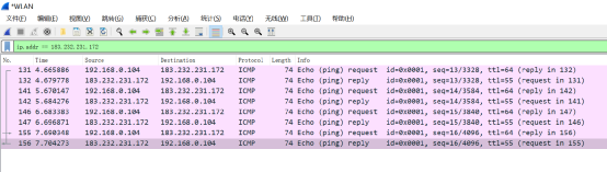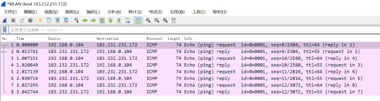 6、为避免其他无用的数据包影响分析,可以通过在过滤栏设置过滤条件进行数据包列表过滤,获取结果如下。说明:ip.addr == 183.232.231.172 and icmp 表示只显示ICPM协议且主机IP为183.232.231.172的数据包。说明:协议名称icmp要小写。