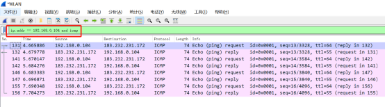 过滤多个条件组合时,使用and/or。比如获取IP地址为192.168.0.104的ICMP数据包表达式为ip.addr == 192.168.0.104 and icmp