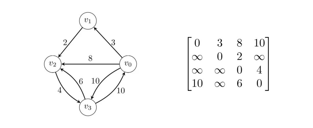 一开始,我们只知道图中直接相连的边的长度,也就是我们的邻接矩阵,我们将其命名为,其中表示从顶点到顶点的路径长度,最后用它来存储从顶点到顶点的最短路径长度。