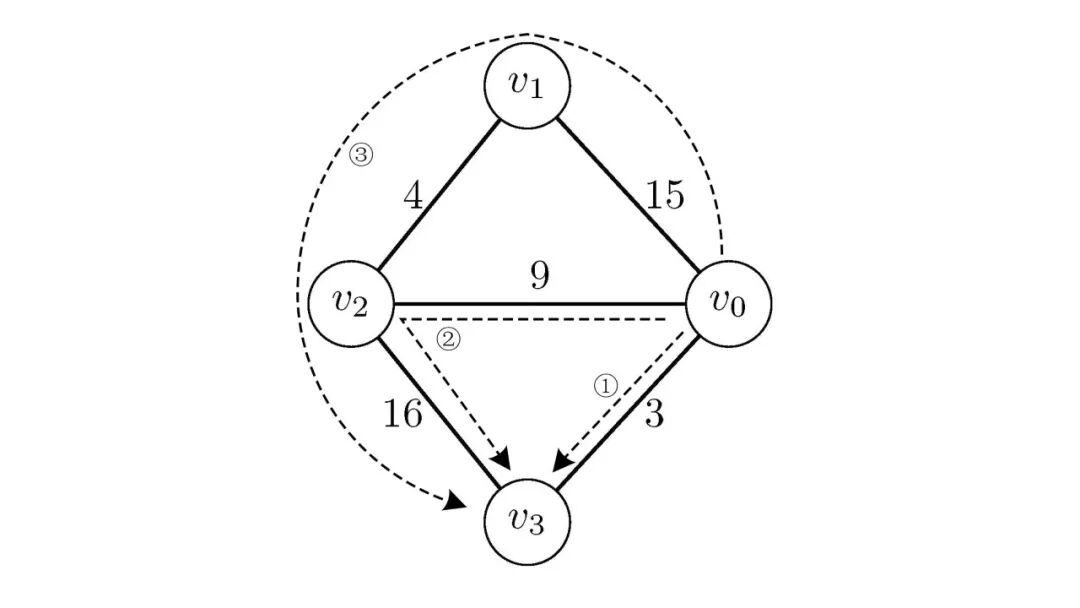 我们可以看到,从图中到有三条简单路径可以走,可以直观看出路径是最短路径,选择过程中也是先被选择进,我们能想办法让这条路径更短吗?我们可以让的权值为,的权值为,这样一来,这条路径的权值为,小于;但是,我们发现,的权值为时,我们就会先选择,而不是,因为此时dist[2]为,dist[3]为,所以会先被选择进,然后再通过更新dist[3],最终我们还是能找到最短路径。