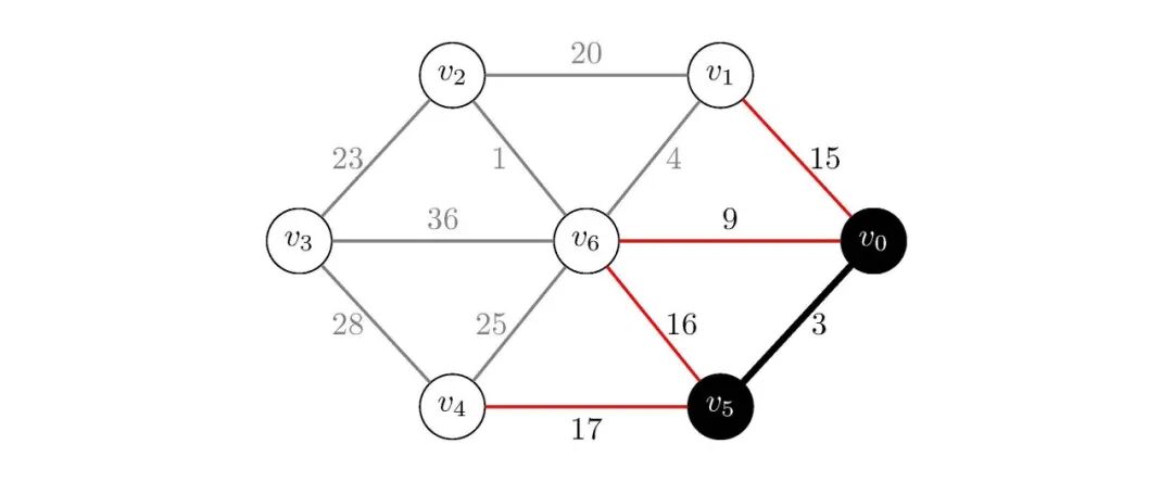 假设我们要从顶点出发去,我们按上述策略就会找出、和这三条边,路径权值为;然而,显然和这两条边的路径权值为,更短。所以说,这种策略并不适用于最短路径问题。