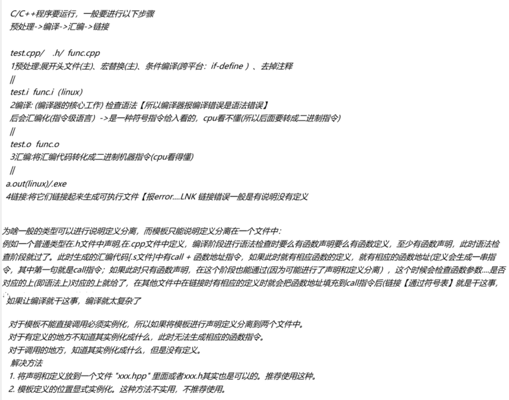 - 将声明和定义放到一个文件 "xxx.hpp" 里面或者xxx.h其实也是可以的。推荐使用这种。