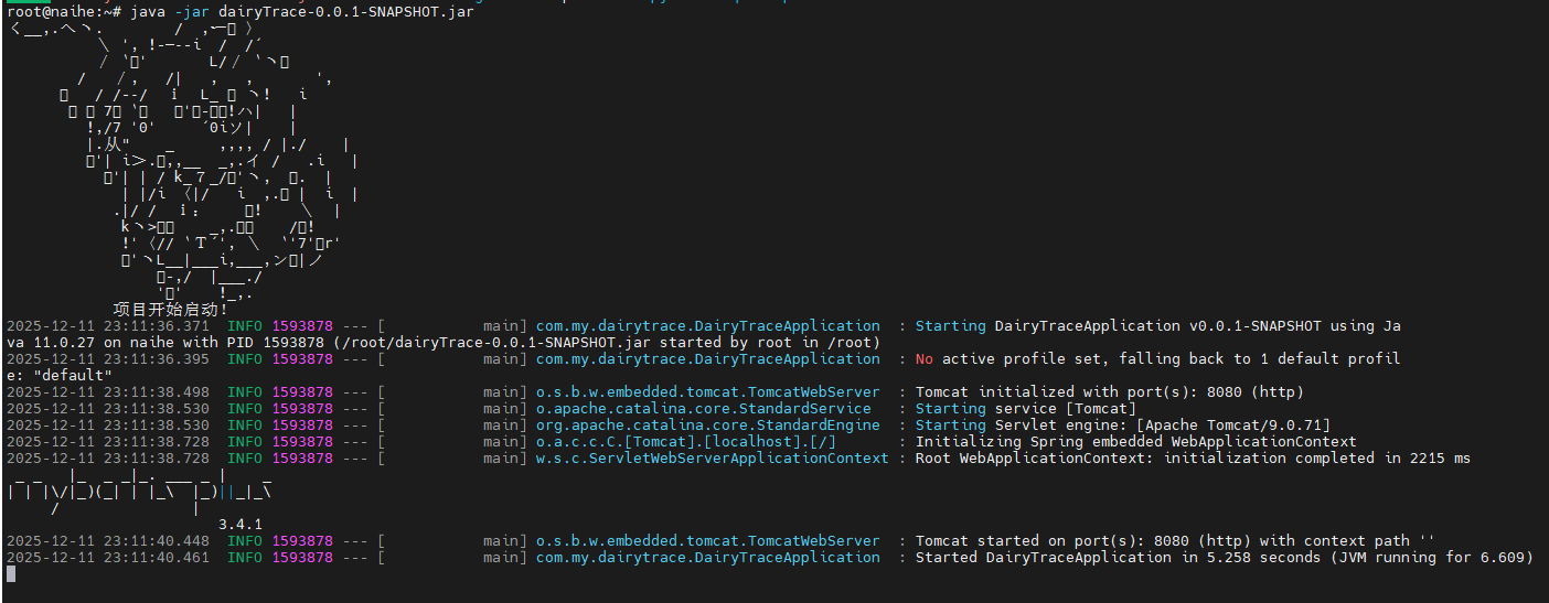 看起来成功启动啦~ 不过,通过"java -jar"命令启动的项目,当终端关闭或断开SSH连接时,项目会随之停止。为了让项目在服务器后台持续运行,需要使用nohup命令