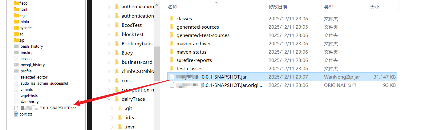 这一步我常使用mobaxterm传文件,很方便,直接把jar包拖到你的目标文件夹即可。