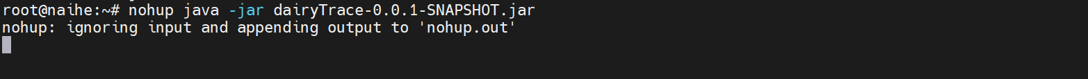 执行命令后,终端会提示"nohup: ignoring input and appending output to 'nohup.out'",表示项目已在后台启动,运行日志会默认输出到当前目录的nohup.out文件中。