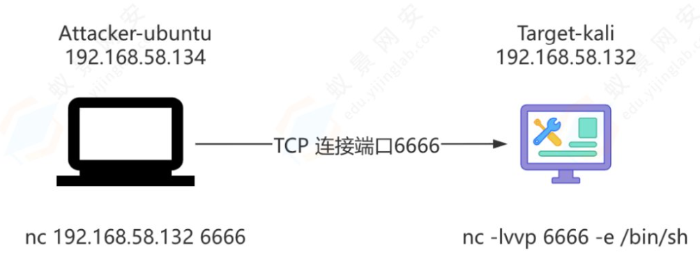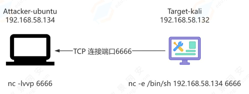 被控端使用nc将/bin/sh绑定到本地的6666端口,控制端主动连接被控端的6666端口,即可获得shell