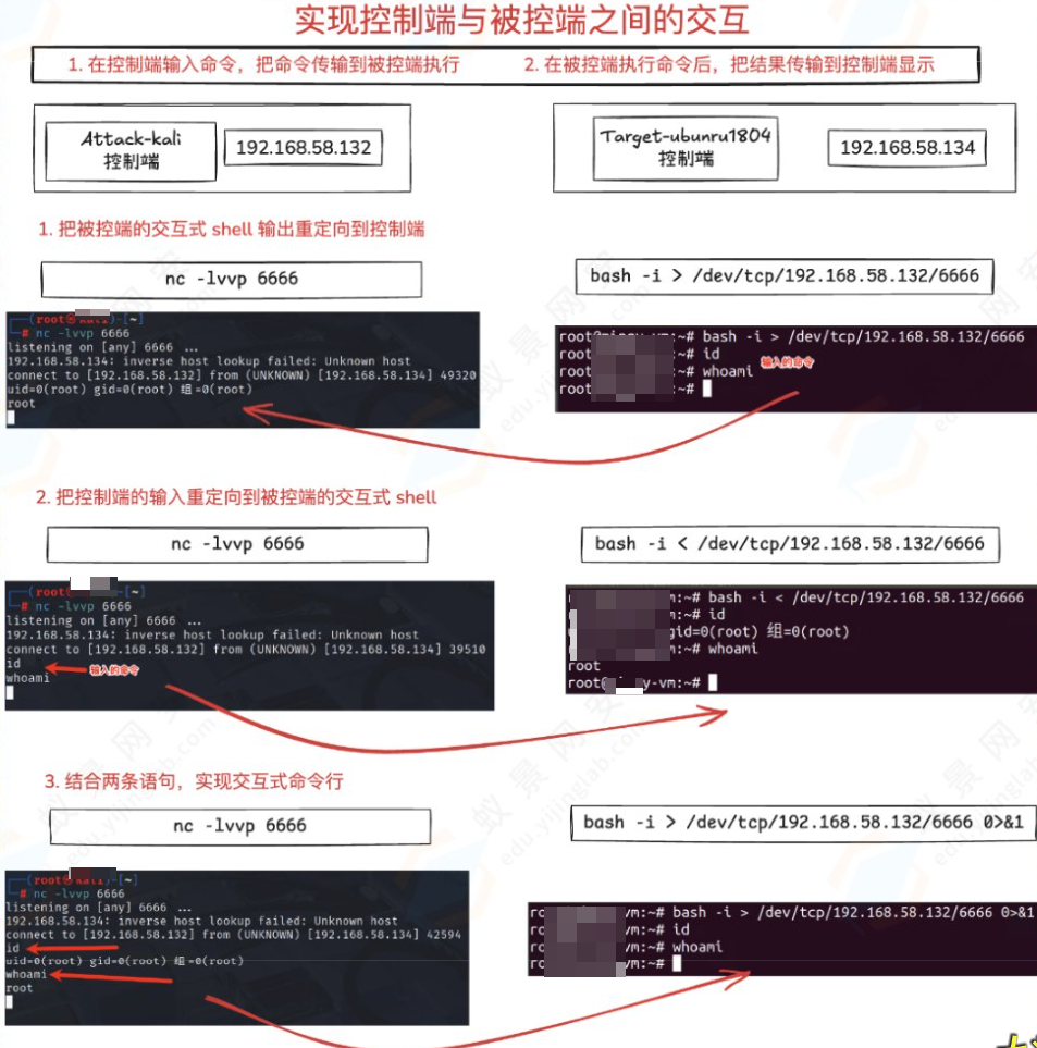 被控端使用nc将/bin/sh发送到控制端的6666端口,控制端只需要监听本地的6666端口,即可获得shell。