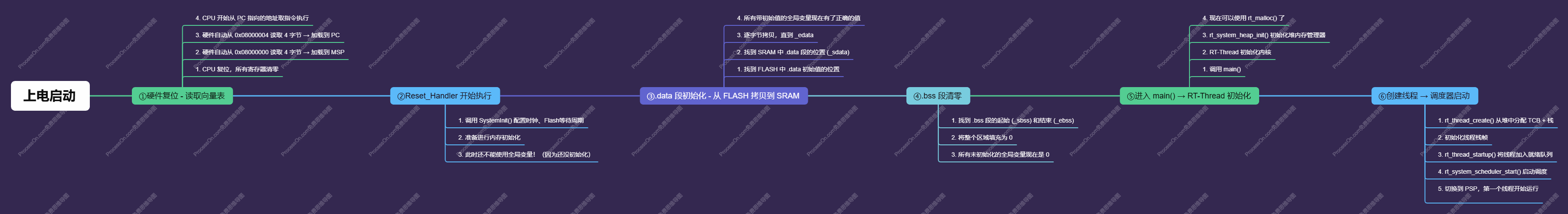 上电后:硬件设置 MSP/PC → 启动代码拷贝 .data → 清零 .bss → 初始化堆 → 创建线程 → 运行