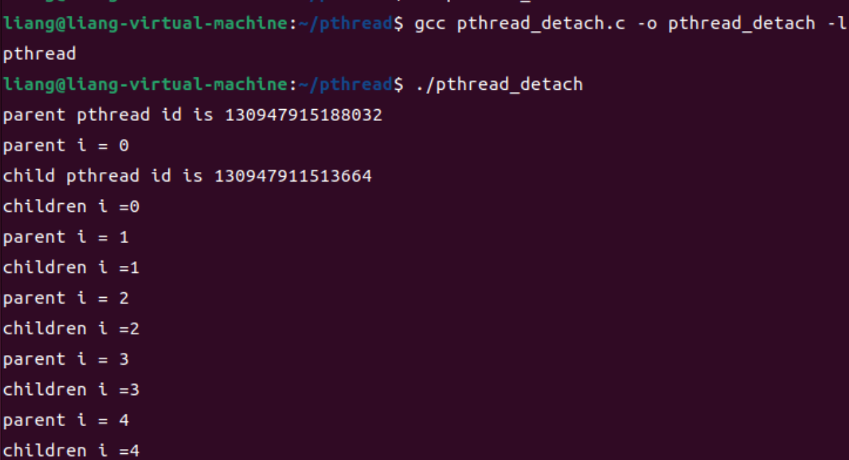 运行结果与第一种方法一样,但是这是创建时直接分离,避免了线程创建失败而导致后续分离操作无效的情况。