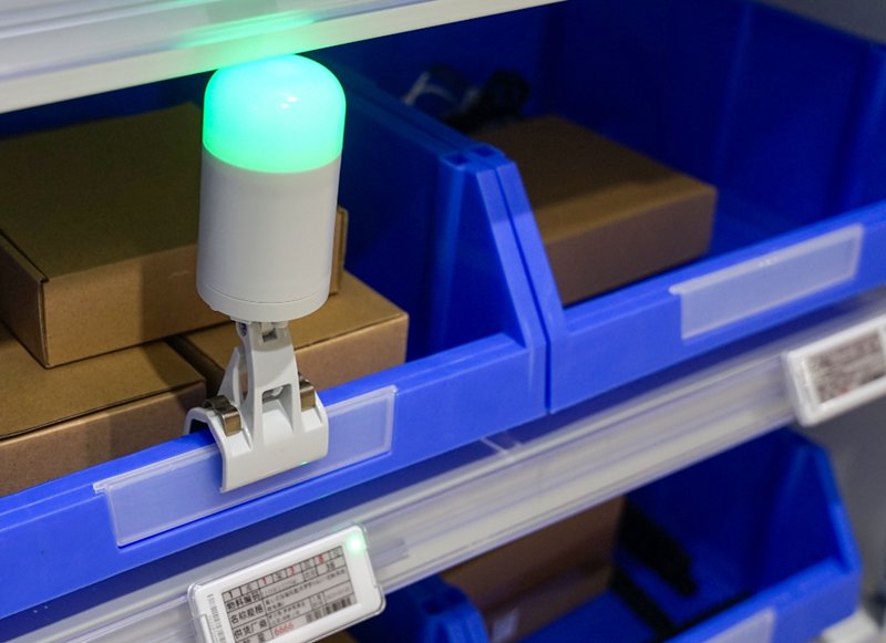 此版本最大的亮点在于标签上集成了3个LED按键灯,其中2个为可自定义的七色灯,1个为固定红色灯。管理员可在系统后台自由设定每种颜色所代表的作业指令,例如:设定绿色代表"备料"、蓝色代表"出库"、红色代表"加急出库"。在实际操作中,当一个储位需要在短时间内处理多个不同批次或状态的订单时,亮起的不同颜色按键能清晰、直观地告知拣货员当前最优先或需要执行的具体任务,实现"一标多用",复杂调度一目了然,显著优化了波次拣选和批量处理的效率。