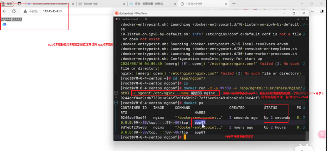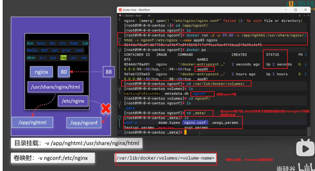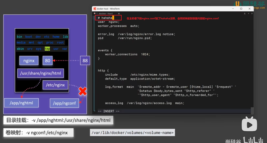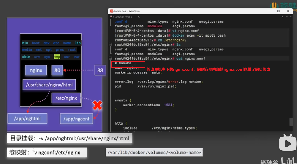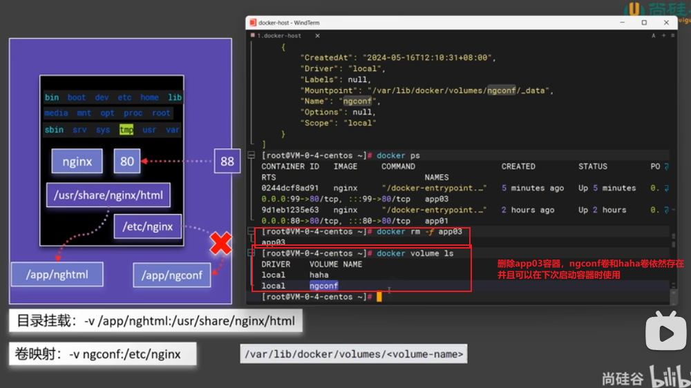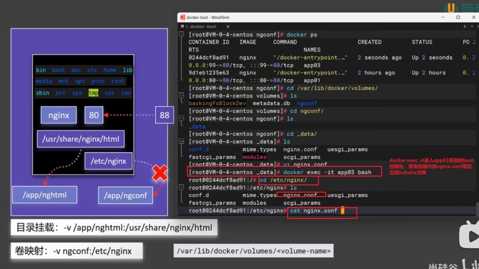 注意:看第2张图,删除一个容器并不会删除卷,比如启动容器app03时创建了ngconf卷,在删除了app03后,ngconf卷依然存在并且可以在下次启动容器时继续使用,即ngconf卷仍然保留着之前的所有改变,即仍然有已经被删除的app03镜像的主机nginx.conf文件添加的hahaha注释