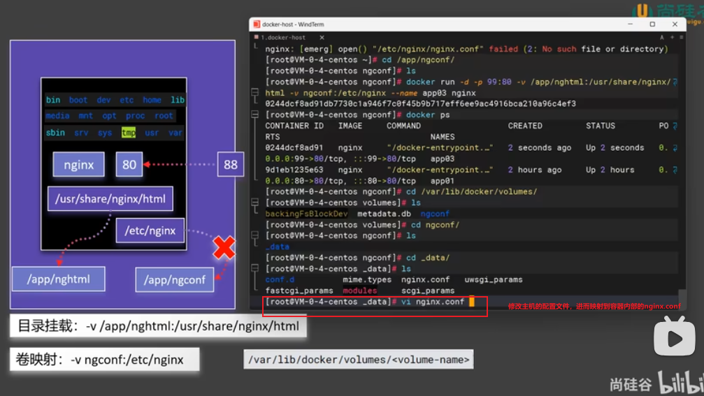 如下第3张图及之后图,再去修改容器内部的nginx.conf配置文件,就直接vi修改主机卷下的nginx.conf文件即可