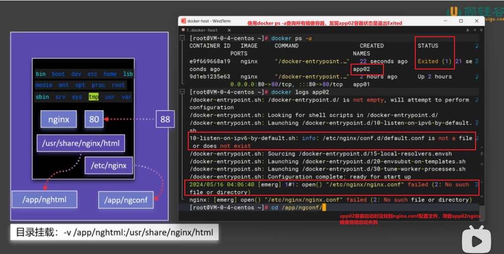 nginx容器内部的配置文件nginx.conf使用-v命令目录挂载到本机并不能成功,原因是在启动容器时使用-v命令将容器内部的nginx.conf配置文件挂载到主机上时,会默认在-v指定的主机的目录位置创建一个空文件夹,而此时空文件夹里没有任何文件,即也没有nginx.conf配置文件,则挂载到容器内部的文件目录下也会导致-v中的容器内部的文件目录下什么文件也没有,那容器启动时使用默认的容器内部目录的配置文件就会导致nginx镜像找不到nginx.conf配置文件,导致启动失败